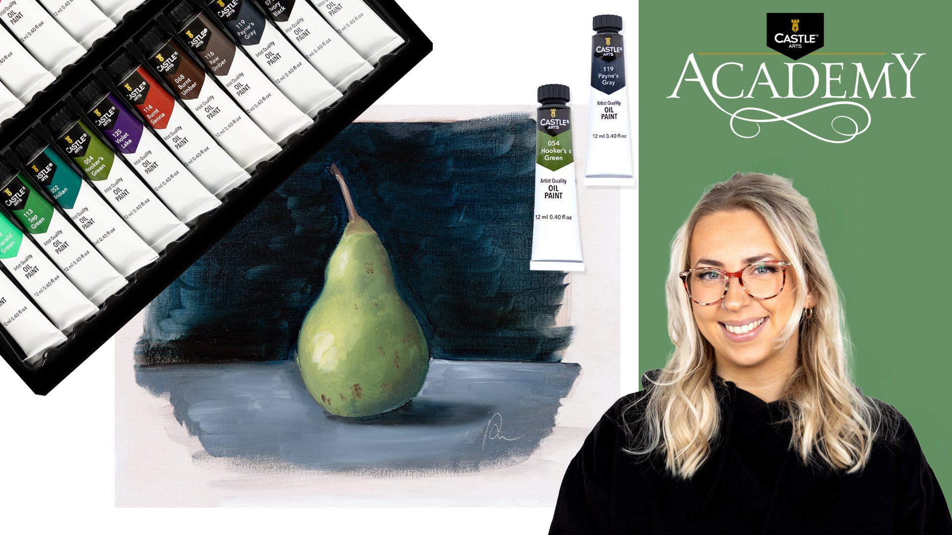24 x 12ml tubes: Citroengeel, Cadmiumgeel, Terracotta licht, Geel oker diep, Koraal, Vermiljoen, Alizarine karmozijnrood, Roze, Paars meer, Pruisisch blauw, Ultramarijn, Kobaltblauw, Blauwgroen, Smaragdgroen, PHthalo Groen, Kasteelgroen, Pruisisch groen, Frans violet, Gebrande Sienna, Gebrande omber, Van Dyck-bruin, Houtskoolgrijs, Lampzwart en CChinees Wit.