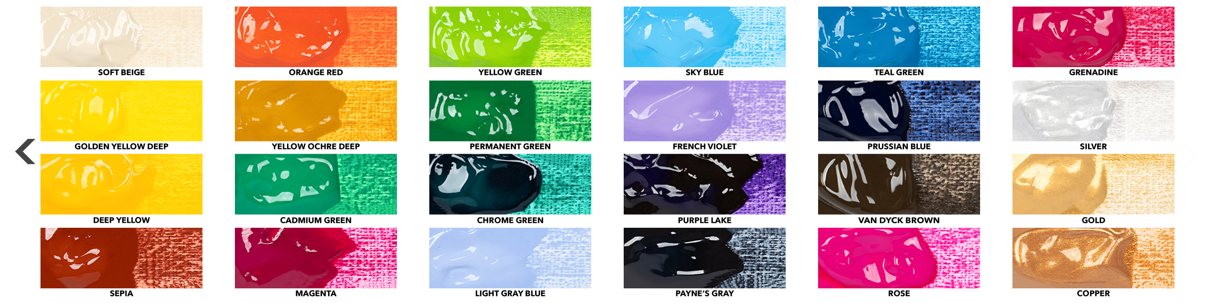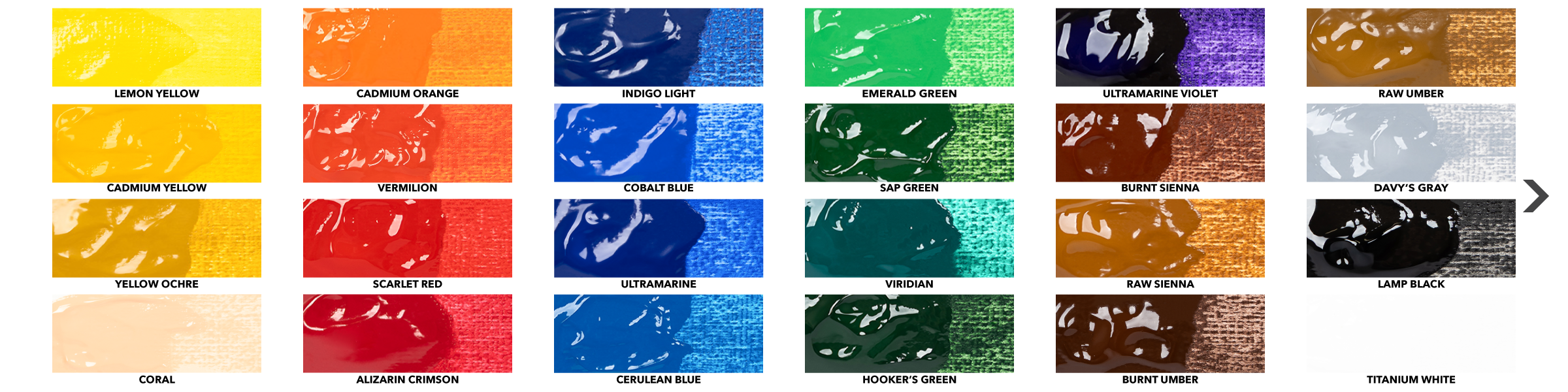 48 22ml tuby: Cytrynowa żółć, Kadmowa żółć, Żółta ochra, Koralowy, Kadmowy pomarańczowy, Cynober, Szkarłatna czerwień, Karmin alizarynowy, Indygo jasny, Kobaltowy niebieski, Ultramaryna, Błękitny błękit, Szmaragdowa zieleń, Soczysta zieleń, Zieleń viridian, Zieleń Hookera, Ultramarynowy fiolet, Palona sienna, Surowa sienna, Palona umber, Surowa umber, Szarość Davy'ego, Czarny lampowy, Tytanowa biel, Miękki beż, Złoty Żółty Głęboki, Głęboko Żółty, Sepia, Czasczerwony, Żółta ochra Głęboki, CAdmium Zielony, Mwiekenta, Żółty Zielony, Stały Zielony, Chroja zielony, Jasnoszary Blue, niebo błue, francuski Violet, Fioletowy Jezioro, Payne'a Szary, Turkusowy Green, błękit pruski, Van Dyck Brown, Rozobacz, Grenadyna, Srebrny, Złoto i miedź.