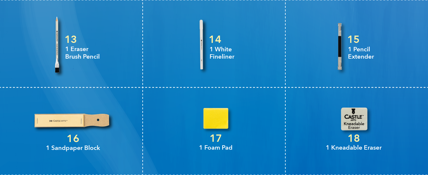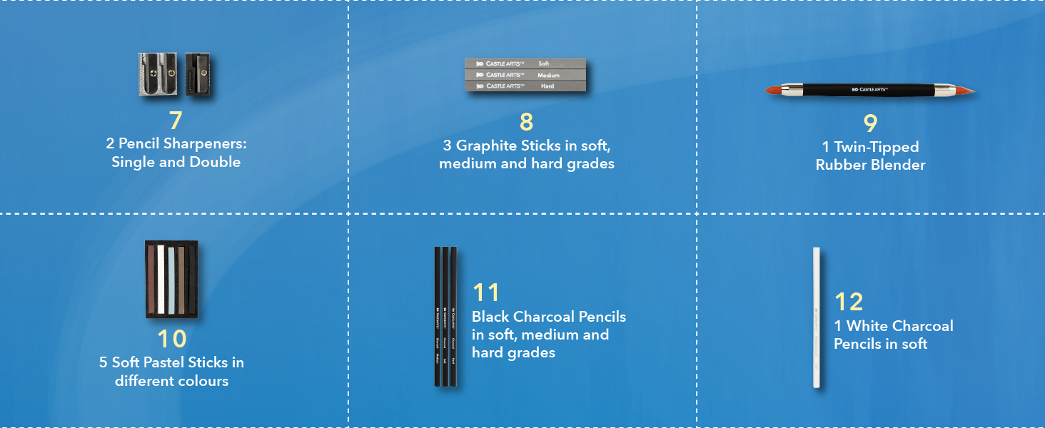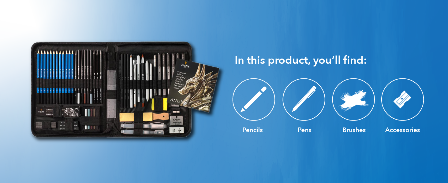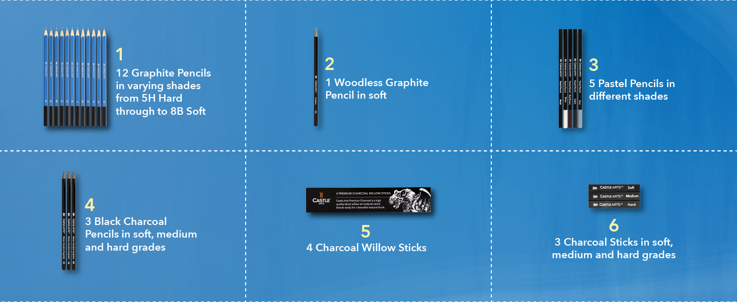 WSPANIAŁA SIŁA OGNI Przygotowane przez wewnętrznych artystów dla szkicowników – doświadczonych i uczących się: ołówki grafitowe + sztyfty, ołówki węglowe + sztyfty, ołówki pastelowe + sztyfty, ołówki rozpuszczalne w wodzie + pędzle wodne, cienkopisy oraz blendery, gumki i narzędzia.