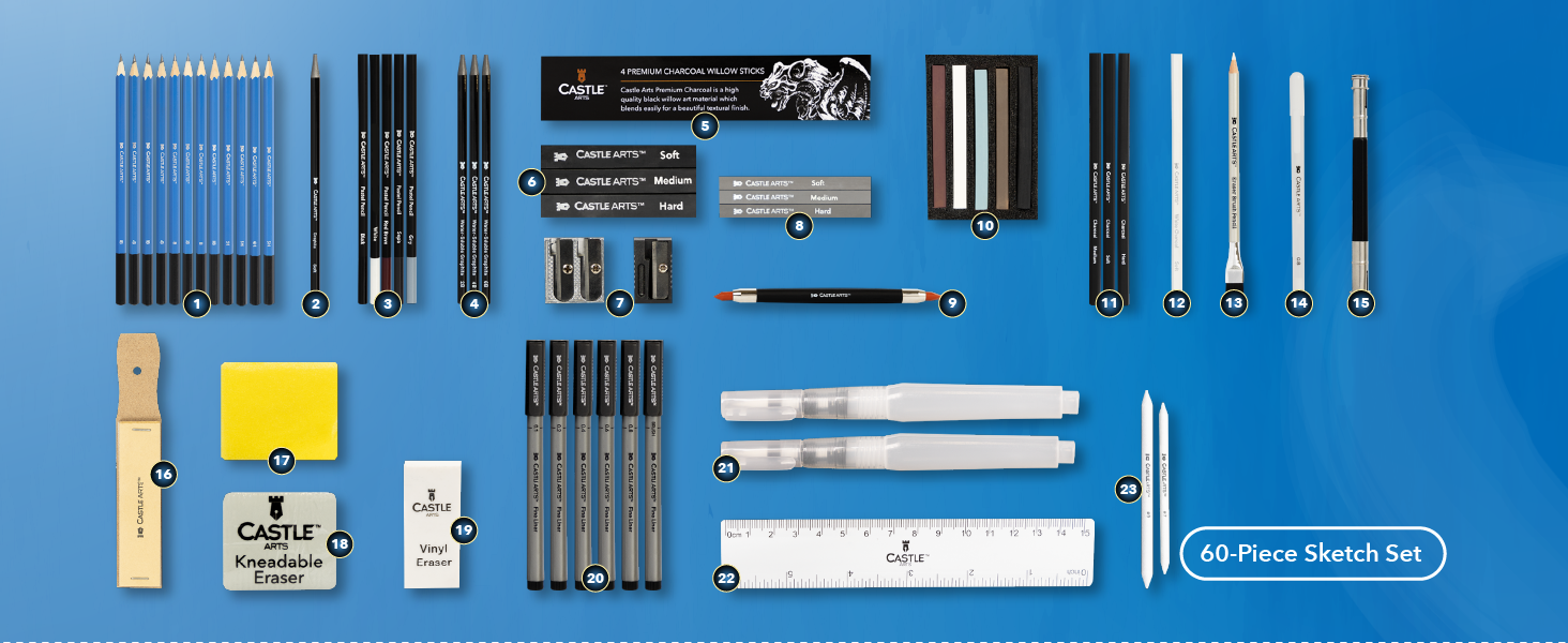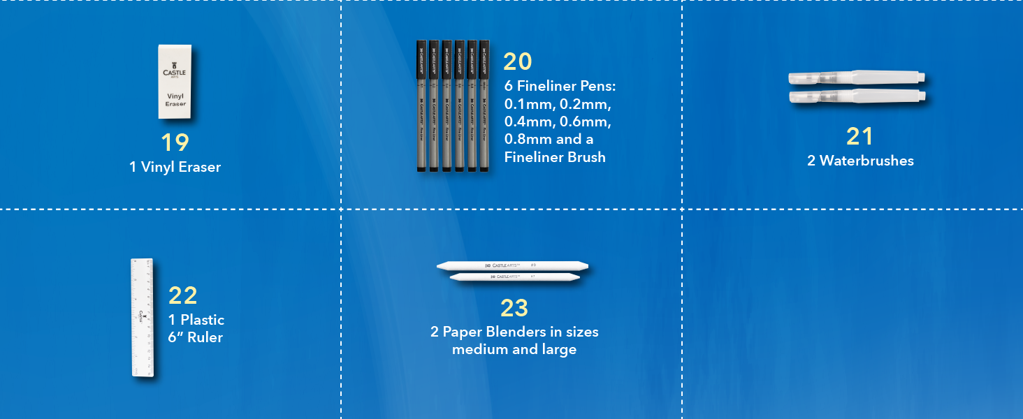 PRZEWODNIK ROZWIJAJĄCY SWOJE UMIEJĘTNOŚCI Szczegółowa, łatwa do zrozumienia 28-stronicowa książeczka wypełniona prezentacjami i wskazówkami, jak najlepiej wykorzystać przybory artystyczne, a także samouczkiem i wyborem szkicowników.